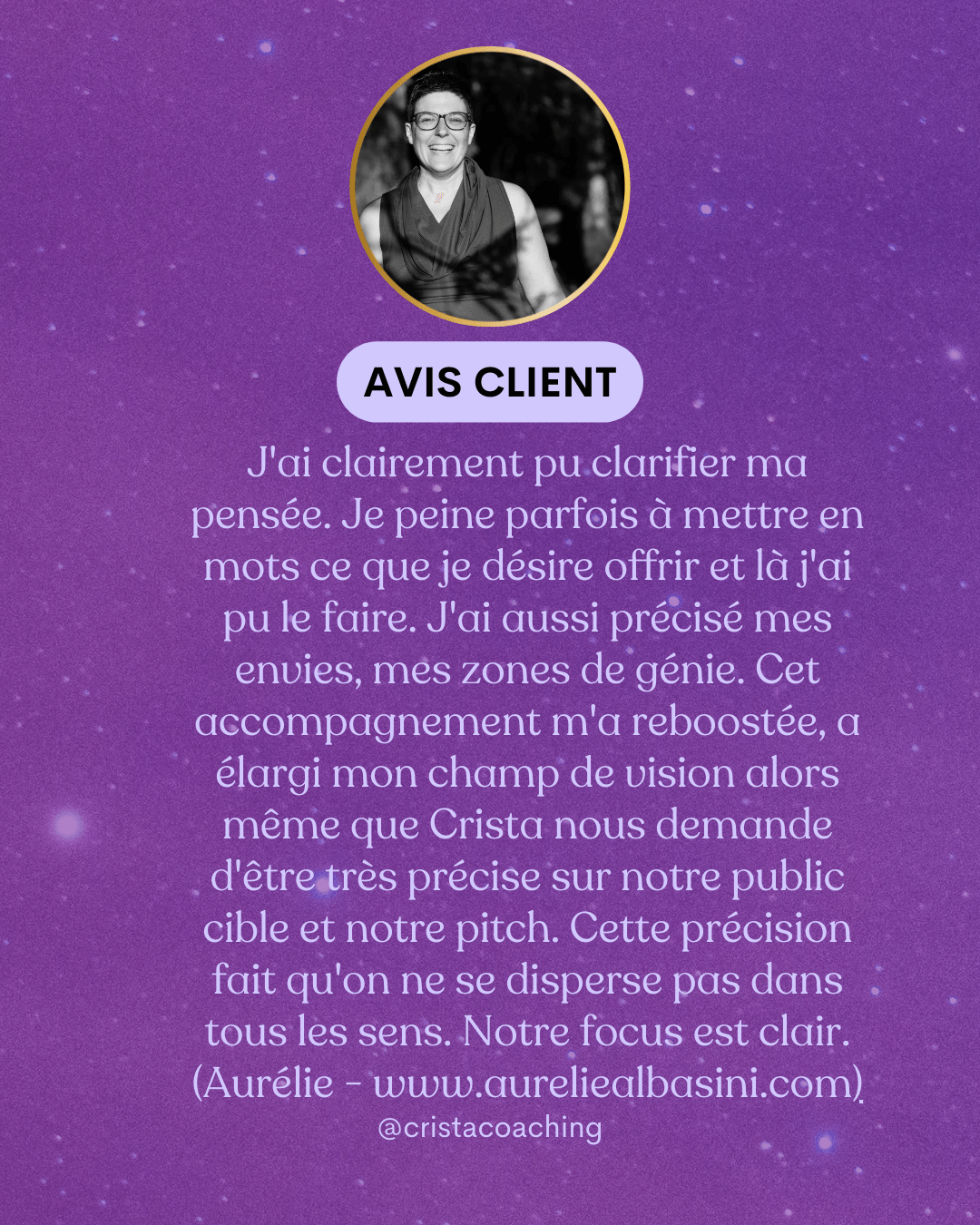 Aujourd'hui, à travers ma méthode et mon académie, je guide les entrepreneurs audacieux à développer un état d'esprit gagnant, à concrétiser leurs projets ambitieux et à vivre une vie professionnelle épanouissante et vibrante en créant leur offre signature unique.